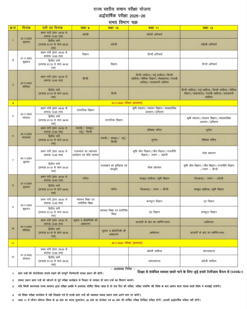 Ans :- राजस्थान कक्षा 10वीं की अर्धवार्षिक परीक्षाएं 20 नवम्बर 2025 से शुरू की जाएगी।